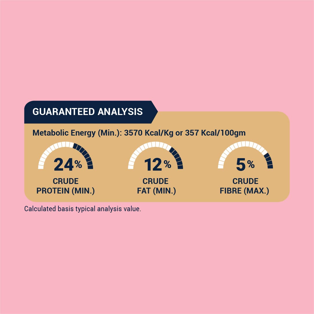 | Crude Protein (Min.) | Crude Fat (Min.) | Crude Fibre (Max.) | |