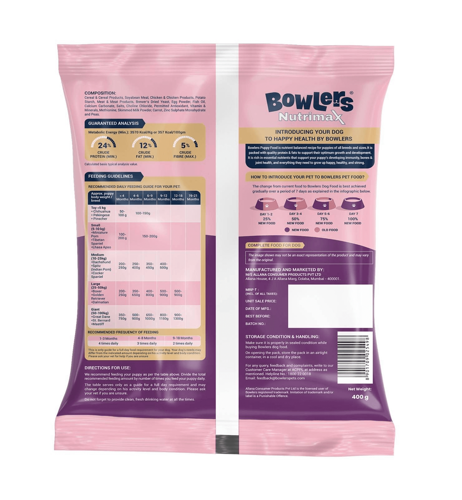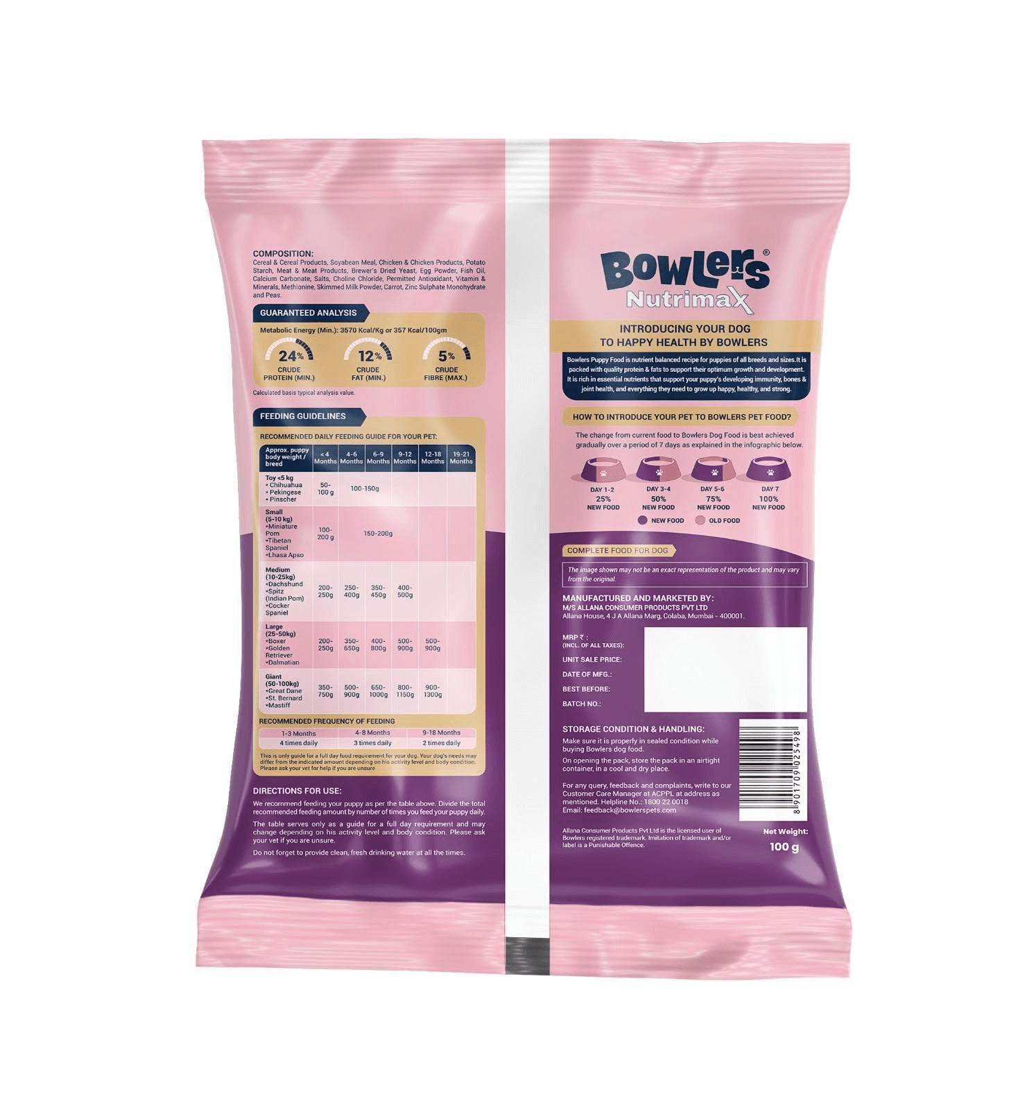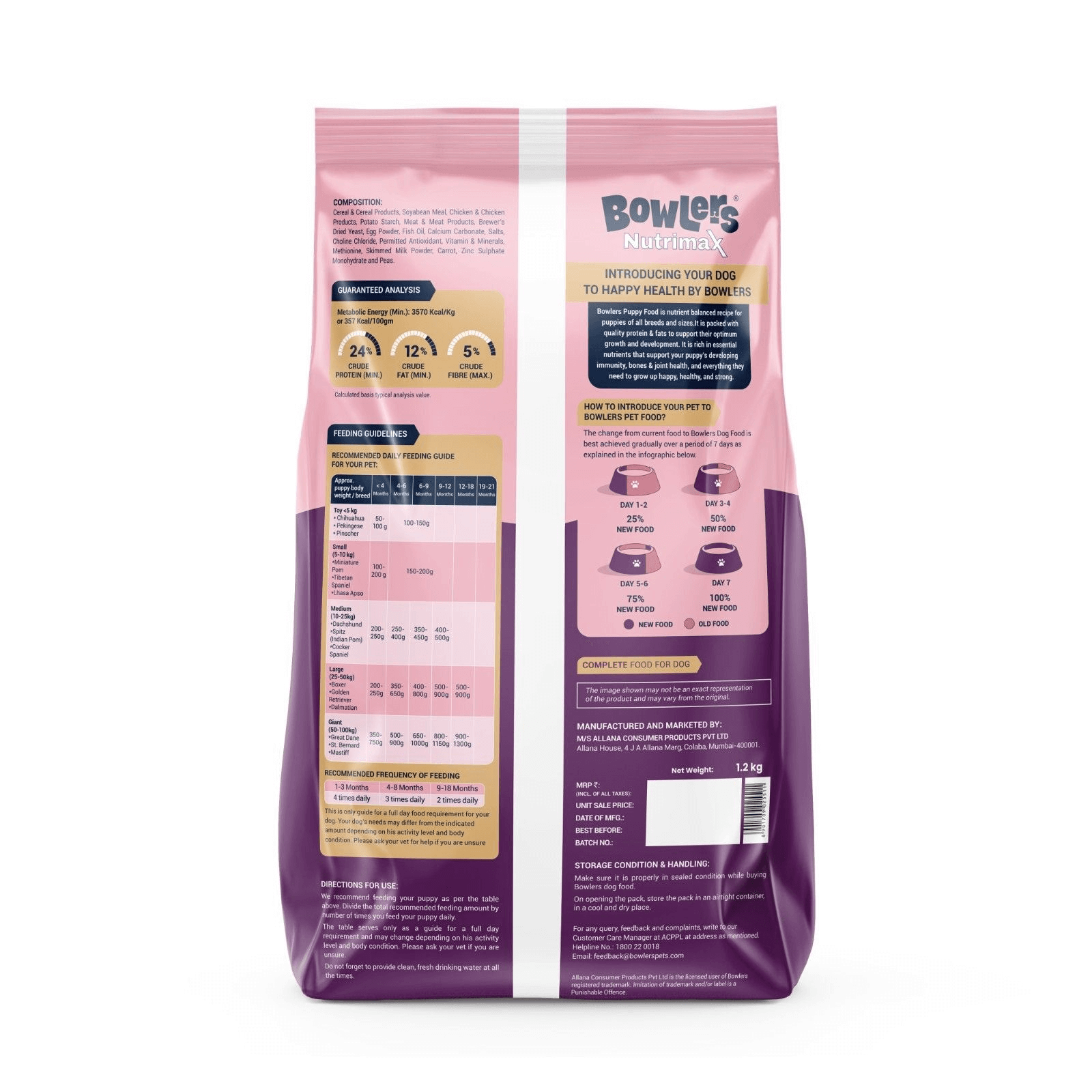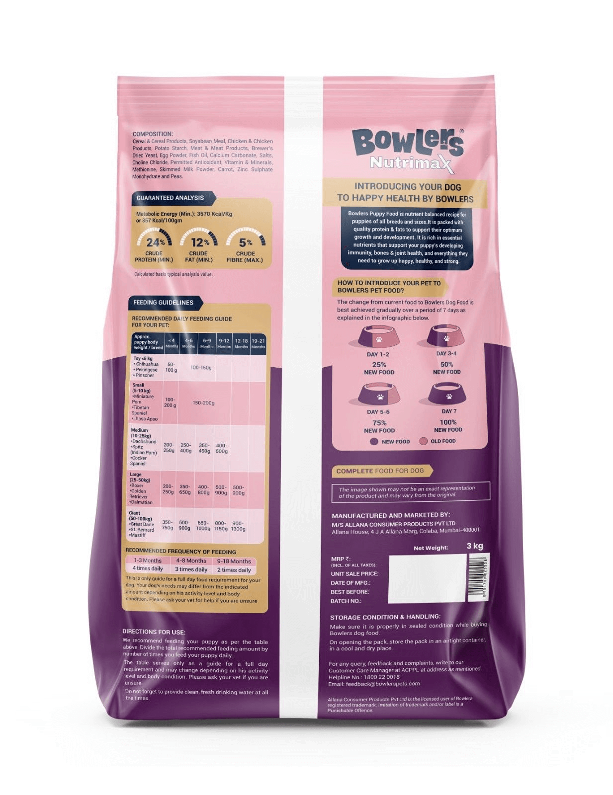 Bowlers Nutrimax Puppy Formula is an HONEST and Exceptional, Nutrient-Balanced blend crafted with natural antioxidants to support healthy growth and development for puppies of all breeds and sizes. It contains high-quality proteins for building strong muscles and is enriched with essential nutrients to promote a healthy digestive system and overall vitality.